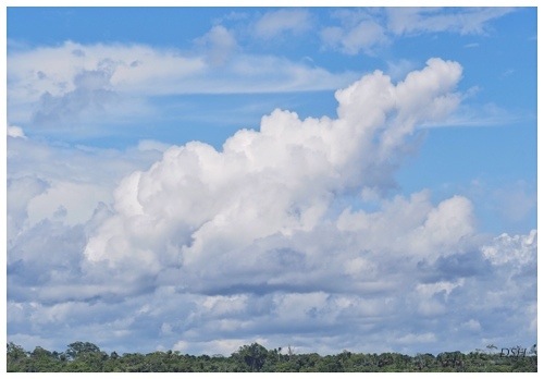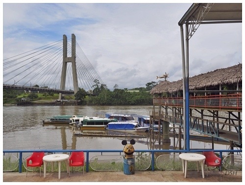 Our flight to Coca only took a half hour. While waiting for our boat, we spotted what I hope is only the first of many monkeys, scampering across a railing. We joined eight other travelers for a two-hour ride in a motorized canoe down a liquid super highway, Rio Napo, which flows southwest to Peru and joins the Amazon River. We sped along, slowing occasionally, perhaps to avoid half sunken logs, and passed many colorful barges. The clouds were amazing, and slowly darkening.