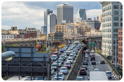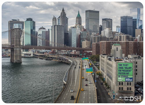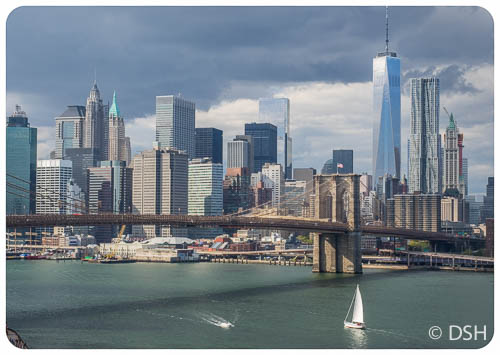 According to Jennifer’s fitbit, we walked about 26 miles during our three-day visit. I had wanted to walk across the Brooklyn Bridge, but it’s closed due to construction. Instead we took a ferry to Brooklyn and walked back across the Manhattan Bridge. I loved the views and took photos in between rumbling trains. The Freedom Tower makes a beautiful addition to the skyline; I like how it reflects the sky and clouds.