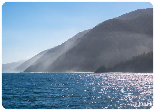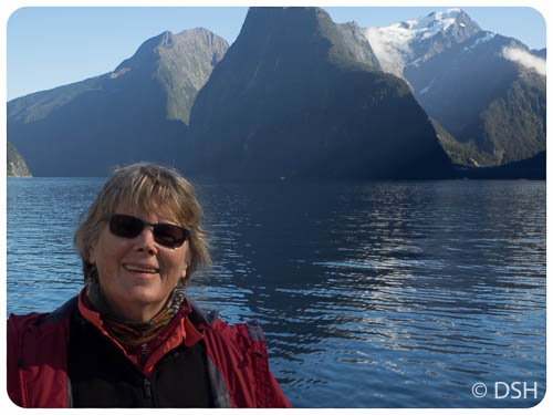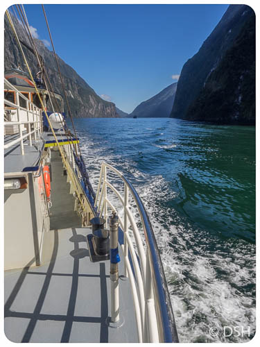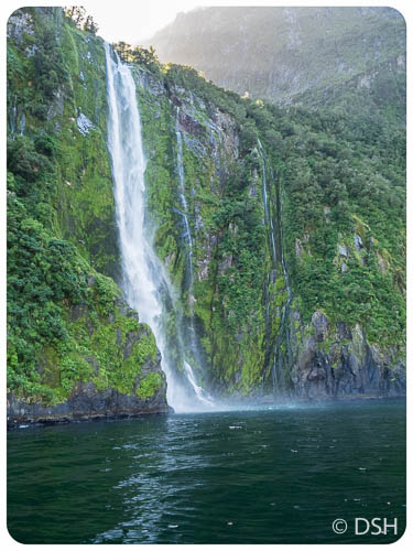 I’m glad I got there early; it gave me a chance to take photos while the water was still enough for reflections and the crowds had not yet arrived. I took a 2.5 hour nature cruise, rather than the regular two hour cruise. The extra half hour allowed us to travel closer to shore where we could more clearly see the rainforest clinging to the cliffs and waterfalls from recent rain. Though it was a beautiful sunny day, it was cold when we were in the shadow of the cliffs. I was colder than I had been tramping, glad I had a thin pair of thermals to put on under my pants, and regretted not bringing my puffy jacket. The complementary mochas were most welcome.