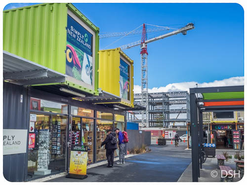 I spent much of the day exploring Christchurch city centre. Many downtown buildings were destroyed in the 2011 earthquakes and the whole place looks like a construction zone. They’ve done a good job making it pedestrian friendly, despite the mess, with art installations, flowers, and decorative perimeters around constructions sites, some with view windows. I visited the Cardboard (a.k.a. Transitional) Cathedral, built within two years of the quake with many cardboard components, and the Container Mall