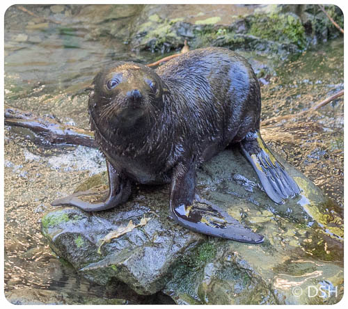 Cute frolicking seal pups! I stopped to see them at Ohau Point on my way to Picton. The adults slept while the youngsters romped. The pups also make their say upstream to Ohau Falls. I saw them playing in the stream all the way to the falls. It was a challenge to take pictures of moving seals in dim light.