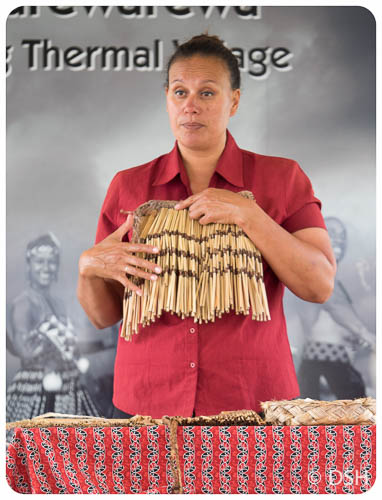 Demonstrating how the skirts are made, introduced after Europeans arrived