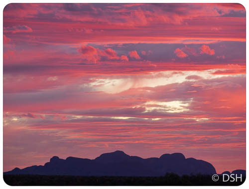 We were up at 5:00 a.m. so we could have breakfast before driving to the Kata Tjuta dune viewpoint. Kata Tjuta (“catta-jew-tah”) means “many heads” in the local Aboriginal language. (This rock formation was previously known as the Olgas). From there the sun rose behind Uluru, far in the distance.
