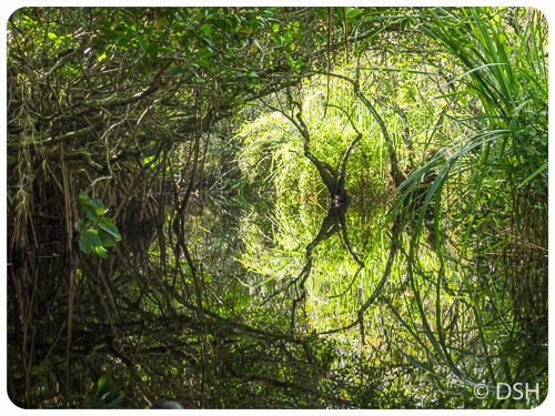 Considering the time change, it was mighty early when I got up to go on a four-hour guided canoe trip into the swamp. The mosquitoes were swarming when we got to the launch site, but they didn’t bother me on the water. The trip was great fun, in spite of a couple chatty couples sometimes spoiling the quiet; the little alligators quickly sunk beneath the surface as we approached. It was almost as magical as the Amazon jungle and not nearly as toxic. My favorite part was going through mangrove tunnels, especially when I was the lead canoe and had smooth reflective water in front of me. If I return, I’d consider doing the ten-mile trip from the launch site back to Everglades City, provided someone had recently gone through the tunnels and cleared the spider webs.