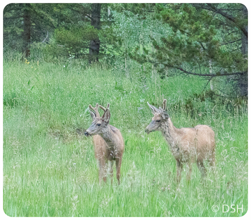 We spotted one distant moose, then came across a herd of elk on our way up Trail Ridge Road. That was exciting. We could hear the cries of the young ones who still had a few spots. We reached the top of the park in time to take a few pics before the rainclouds returned. We cancelled our planned hike and instead drove back to Monarch Lake where it wasn’t raining. We covered this four-mile loop in about an hour and a half; it’s amazing how much easier it is to hike (and breathe) on a relatively flat trail at “only” 8,400’.