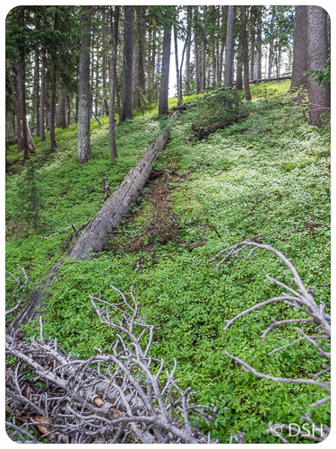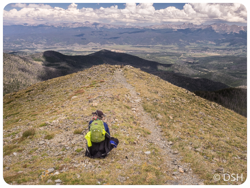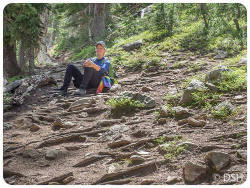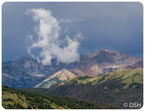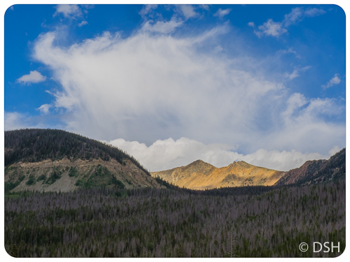 When we woke up, we were thrilled to see blue sky (not what last night’s forecast called for), so we embarked on a tough hike, fulfilling Lynne’s dream to re-climb Byers Peak (12,800’) after thirty years. Unfortunately, the Forest Service moved the trailhead back a couple miles, almost doubling the distance and increasing the elevation gain to 3000’. We rented bicycles to ride up the fire road to the original trailhead, though we ended up walking at least as much as riding. We locked the bikes to a tree, and then hiked up along a narrow, root-filled trail to the ridge below the peak. We took a lunch break, then continued up the last mile. It was exhausting and the gathering clouds were making me nervous, so I turned back about a half-mile short of the summit. I strolled down to just above timberline taking pictures and admiring the view while Lynne continued to the top. Based on the pictures she showed me afterwards, I would have loved to be up there, but I wasn’t up to it at that altitude. We were happy to have the bikes at the end, covering the last mile and a half in minutes. Start to finish, our ride/hike took about seven hours.