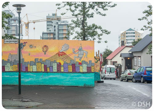 The FlyBus dropped me off at 6:30 a.m. I was able to leave my bags, but couldn’t check into my Airbnb until noon, so I went walking, and pretty much continued walking all day long under overcast, drizzly skies. According to my phone, I covered more than a dozen miles, though it didn’t feel that far since I did it in pieces and Reykjavik is relatively flat (by SF standards at least). I walked up to the famous church that looks like basalt columns, down along the waterfront, and through old town. Along the way, I visited all three branches of the Reykjavik Art Museum and sampled my first Icelandic hot dog, a popular fast food here. There is construction everywhere, a mall and hotel near the harbor, and plenty of generic mid-rise apartment buildings. Some are colorful, but many seem quite dull for a town which frequently has grey skies. I ended my day, after getting settled into my tiny room and showering in geothermally heated sulfur-smelling water, with a yummy fish dinner.