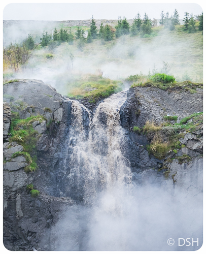 After breakfast, we drove northeast to see Dettifoss, considered to be the most powerful waterfall in Europe (one in Norway has greater average water flow, but is half the height). Our 2.5 km loop, over black lava paths in the rain, included Selifoss, a smaller, scenic waterfall.