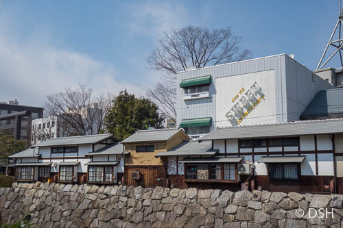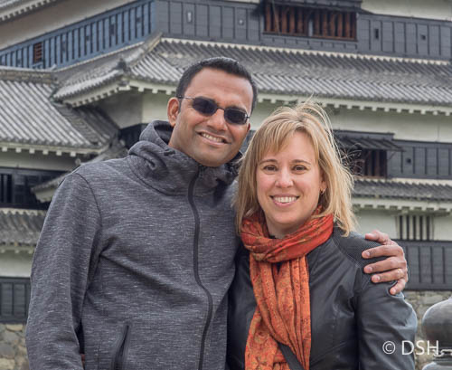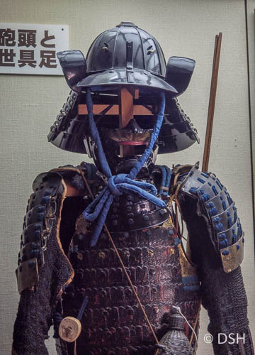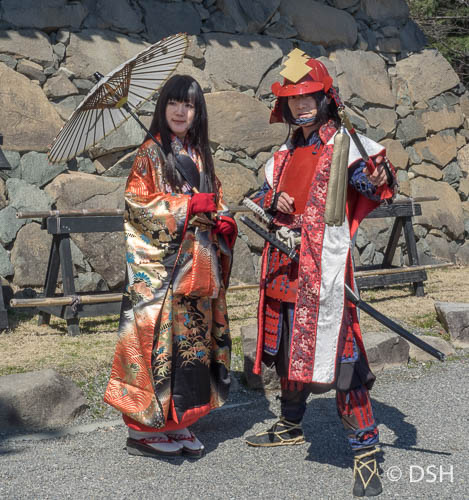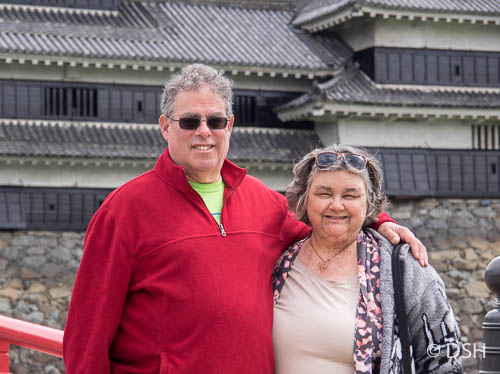 After our walk, we met our group in the lobby and walked back up to the castle for a one-hour tour of the inside. We took off our shoes and walked in our socks across the dark, cold, smooth wood floors. We were shown a hidden third floor, not visible from the outside, that was used for storage, a closing window grate that enabled the samurai to block return fire after they used their firearms, and various display cases, mostly of weaponry. The steps up to the top floors are quite steep.