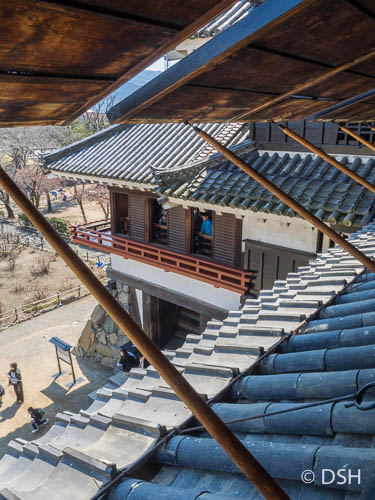 View from inside castle, looking down at a room added to accommodate moon viewing