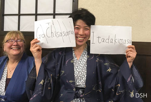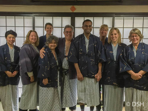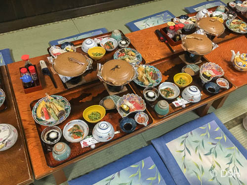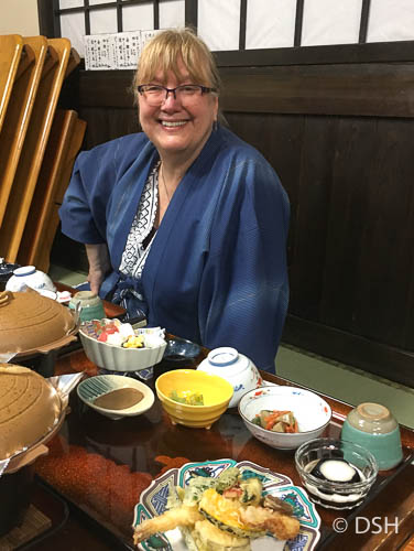 We arrived in late afternoon. Our host picked up our luggage from the bus station and we walked, in a light rain, to our guesthouse near a large torii gate along the river. We stored our shoes and put on slippers, which we slipped off before walking onto the tatami mats in our rooms. After settling in, we donned yukata (house robes) and went downstairs to see a beautiful dinner spread out before us. We sat on mats and enjoyed many new dishes eaten in a specific order. Before bed, I enjoyed a soak in the onsite onsen, the small soaking pool filled from a local hot spring.
