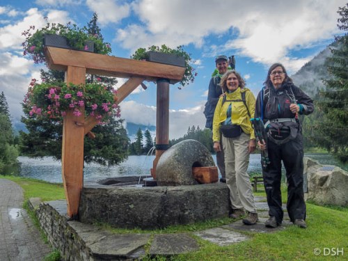 Anne and I decided not to join Hennie and Lynne on the Bovine Route, due to predicted rain and mud. Instead we spent almost four hours in transit (bus–train–train–train–bus) at a cost of over $50, including a snafu with our train ticket purchase (a lot of time and money to avoid walking in the rain). When we got to Champex, a small town along a lovely lake, we had lunch at one of the only open restaurants. I picked the cheapest thing on the menu, a small pizza and a simple green salad. My meal came to about $30; this is an expensive place.