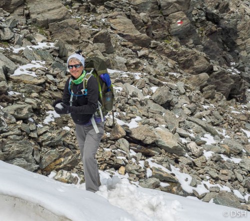 We reread the hike description in our guidebook (Chamonix to Zermatt, the classic Walker’s Haute Route by Kev Reynolds), but there is no mention of rocks or boulders! An easy-to-miss comment does state that the estimated times do not include breaks. We took two, one for a snack and one for lunch; I finally consumed the can of tuna I’d been carrying for days.