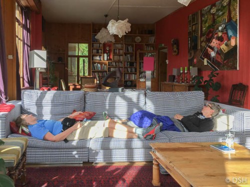 Lynne was napping when we arrived around 1:00. She slept for hours and felt much better afterwards. Our rooms aren’t as nice as last night’s (smaller with no view), but the lounge is huge with windows on three sides. After a shower and a nap, we spent the whole afternoon lounging there, watching storms move across the distant mountains. Our dinner was delicious: a salad with a small quiche, chicken breast with rice and herbs, fresh fruit, and a surprise bottle of champagne from a friend of Lynne’s.