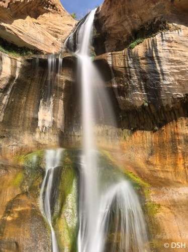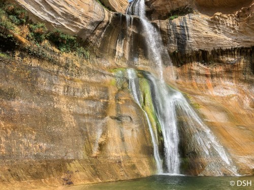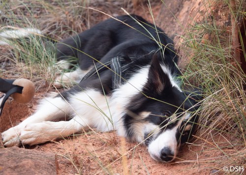 It’s a good thing we got an early start on this scenic hike along the Escalante River; it was 90oF (33oC) by the time we returned to the trailhead shortly after noon. The official brochure says this hike is six miles, but according to our phones it was over seven. The trail was red sand and rock with nice views of red cliffs. The falls were beautiful. The chilly water felt great on my feet and Sage found several willing stick throwers. Along the way we saw a variety of lizards, including one chased by a snake – it got away. Between the heat and all her running back and forth, Sage was exhausted by the time we were done; I have never seen her this tired. The iced beverages that awaited us in the car helped revive us.