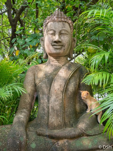 After all that relaxation, I slept until 4:00 am, waking only two hours earlier than usual, not bad for the first day in a new time zone. When Judith arose, we headed to the Royal Palace, discovering Wat Ounalom on our way. This Buddhist temple compound was deserted except for monks heading to prayer. It felt peaceful and spiritual in the early morning quiet. The Royal Palace wasn’t open when we arrived, so we ate breakfast before entering the compound. From our guide we learned that the yellow color of the buildings represents Buddhism, the official religion of Cambodia, and the white Hindu, one of the earlier religions; most Cambodians now practice a melding of both. A flying blue flag let us know that King Norodom Sihamoni was in residence. This symbolic figurehead is elected for life from members of royal bloodlines. We visited the National Museum, a collection of decaying artifacts from antiquity housed in a red building inspired by Khmer temple architecture. Throughout the day we saw several small cats, many with short stubby tails, apparently a common genetic occurrence in Cambodia.