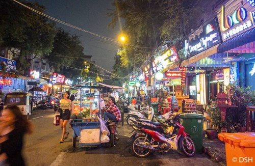 We wandered through upscale shops on 240 Street (Oknha Chhun), most of the cute cotton clothing was too small for me to be tempted. We continued through a more modern part of town, with bigger streets, and yet more vehicles, to Eleven One Kitchen, where we had a delicious chicken and broccoli salad. We took a tuk tuk back to our lodging, puttered a bit, then got another massage. Afterwards, we wandered around looking for, and not finding, groceries, though we came across a street market filled with good looking produce and dead animals covered with flies. We stopped at one of the dozens of bars in our neighborhood and I enjoyed a glass of wine while watching the flow of humanity. It already feels as if I’ve been gone for a week as my everyday world recedes and I’m immersed in new experiences. We had time to shower, with a little hot water, then walked over to Romdeng, a recommended restaurant, not as yummy as our lunch. Most of the tuk tuks here are carts pulled by a motorcycle. We took one back, letting our driver figure out to navigate the crazy traffic in the dark.
