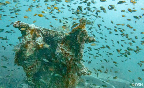 Of the first two dives, early morning was best, before other boats arrived with hordes of divers. This is apparently the most famous dive spot in Thailand. I saw a great variety of fish, from tiny to large, and more coral than at our earlier locations. The water was quite murky and the “currency” was stronger.