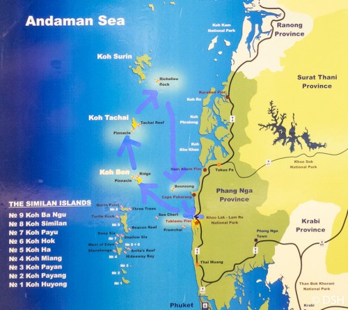 It took us about three hours to reach our first dive site, Koh Bon, one of the Similan Islands. There were five of us in my first group, including two dive masters. We did three dives and while the coral wasn’t impressive, I saw many fish I haven’t seen before. The last dive was in the dark, my first, and possibly last, night dive. Even using a torch, I can see more during the day. I also feel bad about disturbing the fish, though I saw a couple we hadn’t seen earlier and several moray eels on the move.