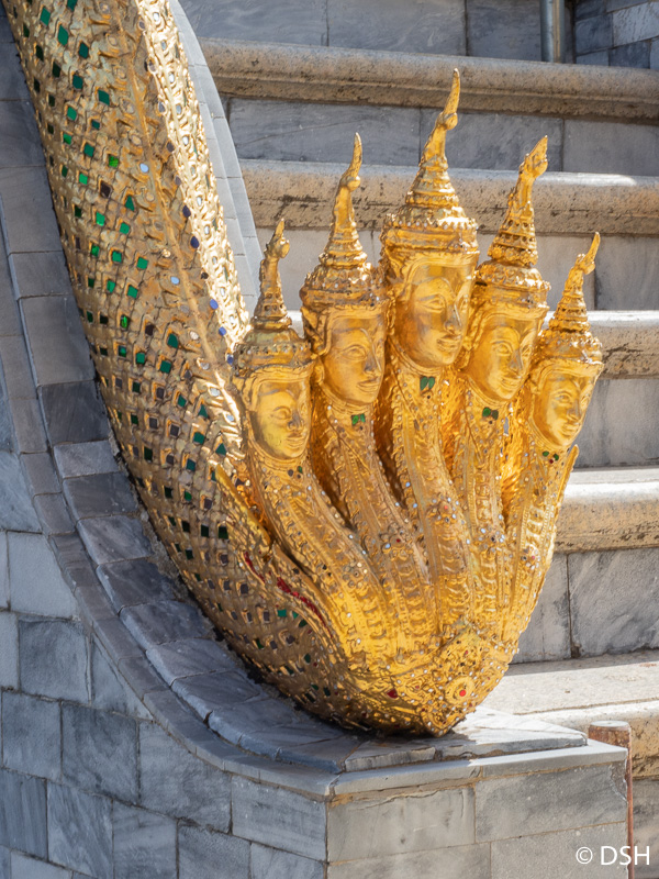 Nagas, protective serpent-like creatures, are seen on many staircases at temples.