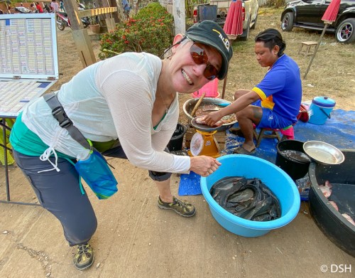 We are staying at a guest house a short distance from BLES. Like most places in Thailand, it had no heat and I needed two quilts to stay warm. We got picked up in a van, along with a young couple also visiting there this week. After a simple breakfast, we spent the whole day with elephants. Three females, nicknamed the Gossip Girls, came down from their night enclosure and hung out nearby, chatting with each other, making a purr-like rumble. We prepared rice patties filled with meds for the oldest elephant. She was used to the routine and came over waving her trunk wondering what was taking so long. I’ve never been this close to an elephant before. Next stop: the medical hut, where Kat and the mahouts treated a couple elephants, one for a foot problem and one for a sore that’s not healing in her back leg. Kat injected fluid in the wound and punched the leg to get out puss.