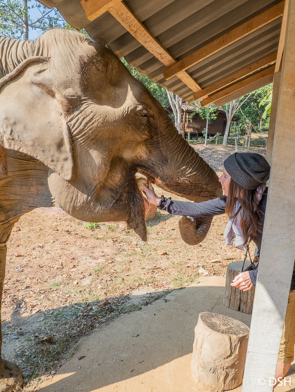 Suzette feeding Pang Fai at Boon Lotts Elephant Sancturay