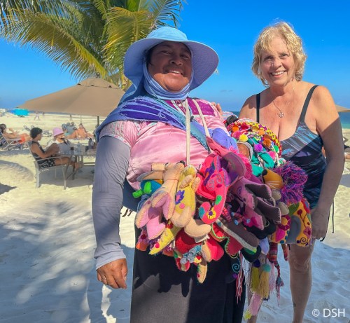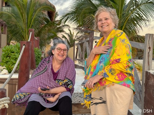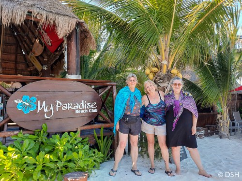 I watched the sunrise with Donna and Bo then lounged on the beach, read, and fixed what became my standard lunch, a mini-quesadilla: two corn tortillas with cheese and leftovers. Carrie woke with a cold and tested negative for Covid. I kept my mask on and car window open while she drove us to Puerto Morales, 15 minutes away. Donna took Bo and me to her favorite shops and we bought a few small souvenirs. I got a t-shirt for Nick and a couple cute beaded birds for friends. Donna is still missing the pre-hurricane plaza, but her favorite bar, My Paradise, is still standing. We lingered there, on the white sand beach, sipping cocktails for several hours. Their mojitos are good. Carrie picked us up, we unsuccessfully hunted for covid tests, picked up more groceries, and headed back to the villa. I had time for a cold shower before Chef Beto come over and cooked us a nice fish dinner.
