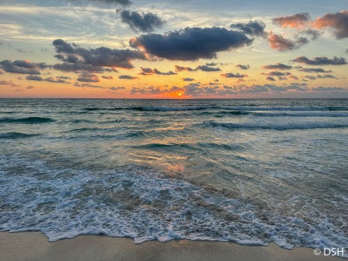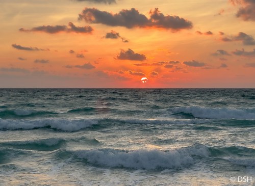 The sunrise was pale but pretty and the wind strong but warm. Donna, Carrie and I spent much of the day in beach chairs while Bo stayed inside with the AC. I swapped my paperback for another from a bookshelf in the villa. Carrie and I played in the water with boogie boards, occasionally catching a short ride. When Donna asked what I liked best about this spot, I told her it was the gestalt: the light, color, sound of waves, light breezes, warm shade, a few puffy clouds. I also took a call from one of the contractors working on my house; it’s always a risk to have work done in my absence and in this case something had to be redone when I returned. I fixed dinner, which we shared with a very hungry calico cat.