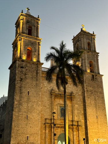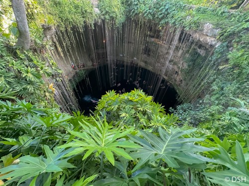 When we finally reached out main destination, Chichen Itza, we were given a short tour, mostly focused on a game involving rings and possible sacrifice, then were left to tour the site on our own, surrounded by the sounds of roaring jaguars and birds, thanks to the hawking of noise-making souvenirs. I bought a t-shirt for Alex. It was late afternoon when we reached Cenote Ik kil. Cenotes are sinkholes containing water. The Yucatan peninsula is essentially a huge limestone slab riddled with thousands of caves and cenotes. I walked down more than a hundred uneven, wet, stone steps to take a refreshing dip in this pool. Our last stop was in the town of Valladolid, where we barely had time to see a church and cross the street to a plaza where noisy birds were flying and birdman dancing. The sun was setting when we departed and it was bedtime when I got dropped off.