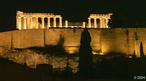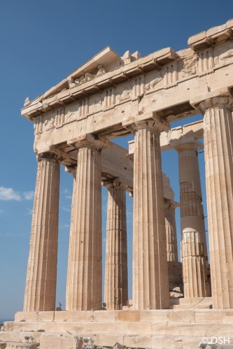 We met Fotini, our delightful guide, near the entrance and she led us up the slippery marble steps; with skip-the-line tickets we bypassed part of the crowd. Though young, she was very knowledgeable and able to answer our many questions. This excerpt from the web sums it up: “During the past 2,500 years, the Parthenon … has been rocked by earthquakes, set on fire, shattered by exploding gunpowder, looted for its stunning sculptures, and defaced by misguided preservation efforts. Amazingly, the ancient Athenians built the Parthenon in just eight or nine years. Repairing it is taking a bit longer.” During one invasion, columns were pulled down so the lead dowels between marble blocks could be melted and formed into bullets.