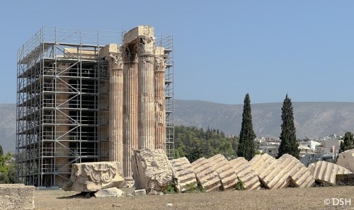 The museum is built over an old neighborhood with ruins visible beneath. Inside, we saw many of the remaining Parthenon sculptures and caryatids, other than ones at the British Museum. After lunch at the museum, I joined the majority for a short, hot walk to the Olympieion (a.k.a. Temple of Olympian Zeus). One of the largest temples in Greece, it originally contained 104 of the tallest columns in Greece. Most of the 15 remaining ones were surrounded by scaffolding.