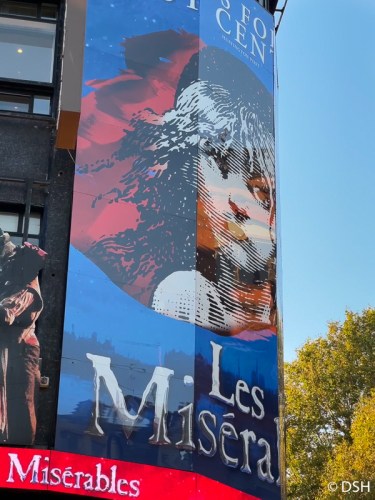 After a short rest, we ate dinner again at the hotel (splitting tuna, salad, and asparagus, all yummy), and took the tube from Waterloo to Piccadilly Circus, and walked through a small Chinatown to the Sondheim Theatre to see Les Misérables. Though it’s a sad subject for a musical, the show was outstanding with great singers and memorable sets, one of the best theatrical performances I’ve seen. We took the wrong exit from the Waterloo station on our way back and walked too far on dark, deserted streets back to our hotel.