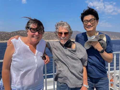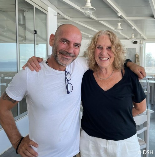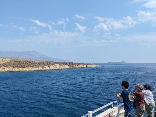 Meghana and I took our morning walk up and around the little hill between beaches. After breakfast, Shahrazad was carried to an ambulance, and the rest of us boarded the bus back to port. (She was later taken on and off the ferry in a wheelchair; I admire her good spirts). A handful of us took a short walk through the town before boarding. Larry and Anastasia took a different ferry, heading for another island and a chance to relax without the need to keep track of 15 painters. A dozen of us ate lunch at the same restaurant as on our way out. They were out of the local fish I wanted to try so I had seabass and perfectly cooked vegetables. The proprietor called four cabs for us and we headed off in different directions.