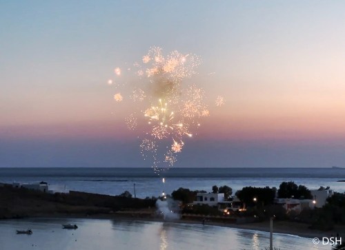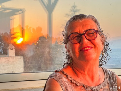 Susan and are sharing a large room with a balcony overlooking the Aeronian sea. After getting settled, we joined the group for dinner at 7:30 (19:30). We have two large tables reserved for us in a shaded spot on the veranda.­ Here we ate all our meals. The breakfasts were at 8:00 buffet style; I had spanakopita and yogurt every day, and too many pastries. Lunches, at 1:30 (13:30), were light with bread, tziki, and delicious green salads, including one with shredded zucchini for which I now have the recipe. We had two entrée choices each evening, none very appealing, and all vegetables over cooked. It was a challenge to avoid nightshades. The sunsets were lovely.