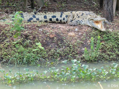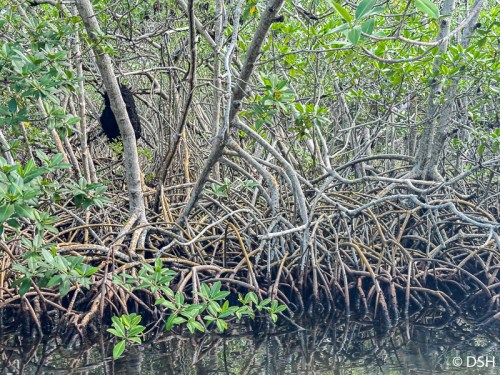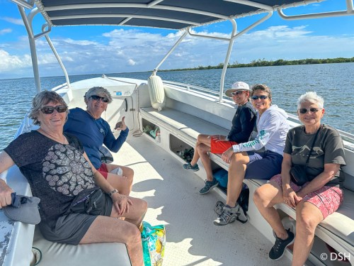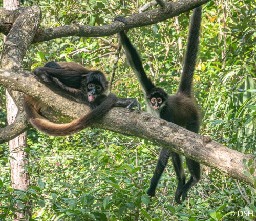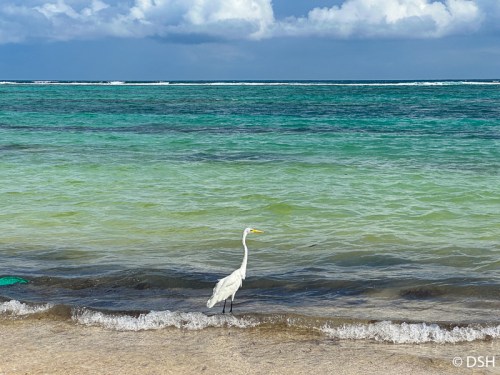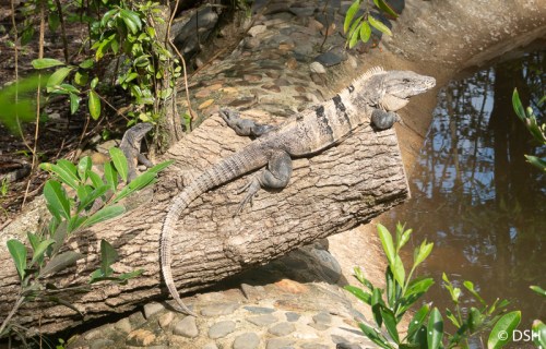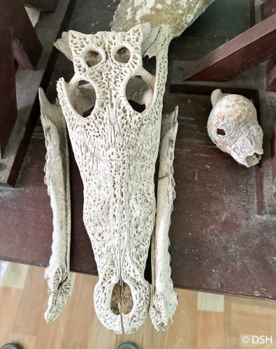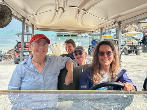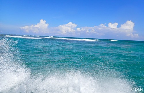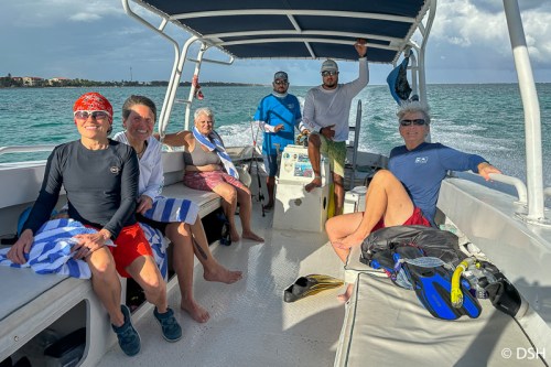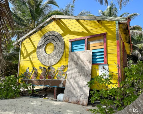 Our prayers to the sun god worked; no rain fell on us today. After an early breakfast at our hotel we walked through town to Searious Adventures where we boarded a boat for a private tour around Ambergris Cay. In a narrow channel across the island we saw heron and iguana, then took a long rough ride to the ranger station at Barcalar Chico where we were greeted by two friendly, skinny dogs. We toured the small museum, which has a manatee skeleton, and climbed the observation tour. When we entered the narrow channel separating Belize from Mexico, the first mate asked us to get out our passports to have them stamped. Fortunately, he was kidding since none of us had ours (I left mine in the room safe after drying it with a hair dryer after yesterday’s downpour). This channel used to dead-end, but the Mayans expanded it long ago. We had to go outside the long reef that protects the coast to complete our circumnavigation; it reminded me of time my son, Alex, and I road the Lachine Rapids in Montreal, crash, crash, crash. We ate lunch on a beach – ceviche with conch caught and prepared along the way, and Mayan chicken, beans, and potatoes, prepared by our captain’s mother.