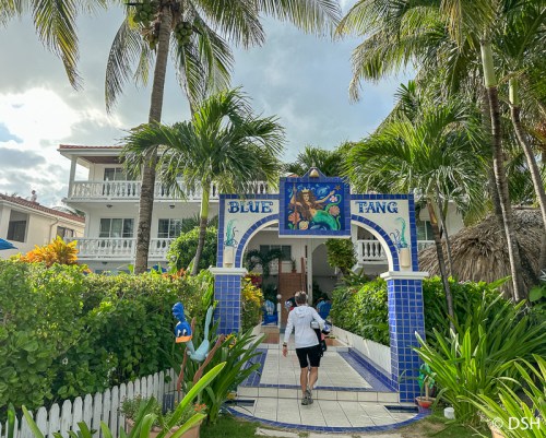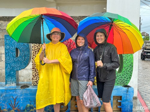 During a break between squalls, four of us walked back into town and wandered through the shops. It rained again but this time I stayed dry under a big umbrella borrowed from our hotel, the Blue Tang. I bought a souvenir hat and a yellow poncho since the weather forecast does not look promising. We had a short break in our rooms then caught a cab to dinner. We all enjoyed the delicious food. My ginger mint Paloma cocktail was tasty, and the Caribbean Chicken stuffed with chaya (a.k.a. Mayan tree spinach) and cheese was amazing. I also sampled Trish’s calamari and plantains which were perfectly prepared. Our taxi driver steered us well. We walked back in a light drizzle.