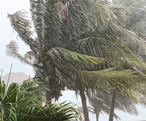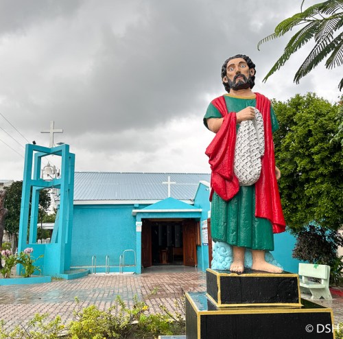 We started out in a rented golf cart under grey skies with Dawnie at the wheel. There wasn’t much to see north of town, mostly flooded roadsides, decrepit and half-built buildings, so we drove back through town. It was a bumpy ride and Nancy’s back began to bother her, so she, Harley, and I decided to walk for a while. Bad timing. The clouds opened up and I discovered that my “waterproof” jacket was not; we were soaked by the time we met Trish and Dawnie at Pineapples. After lunch, we drove directly back to the hotel for a change of clothes, arriving just before an even bigger squall rolled through. We took our wet clothes to the front desk and they returned them later, dried and folded.