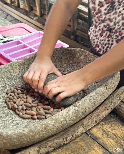 We caught the 8:00 flight back to Belize City, where a van driver was waiting to take us to Placencia, the port city from which we will be sailing. We made several stops along the way, taking all day to travel what otherwise would take a few hours. Our first stop was the Belize Zoo. It’s a small zoo in a natural setting with old cages that let us get close to the animals. My favorites were the monkeys, tapir, jaguar, and owls. We had the place to ourselves for about an hour before a large bus full of tourists arrived. Our van driver knew the zoo well and we saw many animals we would have otherwise missed. Our next stop was Lamanai Chocolate Co where we were walked through the process of turning cocoa beans into a smooth chocolate paste – fermenting, drying, roasting, winnowing to separate shells from nibs, and grinding. Though I no longer eat much chocolate, I tried many samples. We picked up lunch and ate in the van, quesadillas for most of us, and arrived at our hotel an hour before dark.