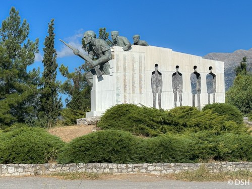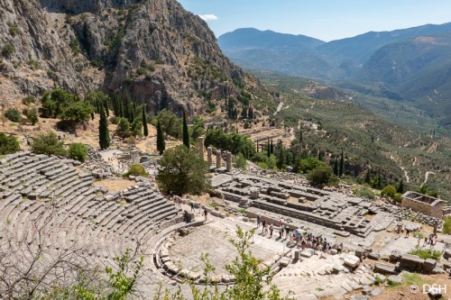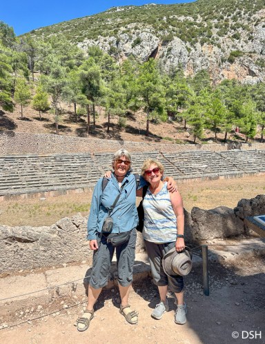 At our first rest stop, we walked across a bridge over the Corinth Canal. This narrow shipping channel, built about 80 years ago, connects the Aegean and Ionian Seas. At another stop, we picked up food for lunch and ate in the van (our driver was worried that he wouldn’t get back to Athens in time for his next ride).