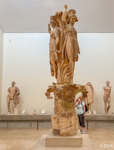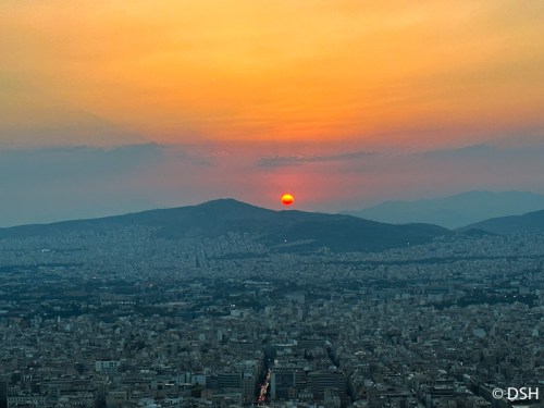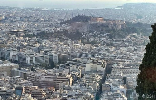 I took the train from the airport to central Athens. The 40-minute ride is supposed to run every 36 minutes; I stood and waited more than that. Flagging taxis was a challenge, and the first driver took a look at my destination and shook his head. I picked up the Airbnb key from a restaurant then wandered up and down the street several times, lugging my luggage, before I found the right door. By then it was 19:00. Lynn and Sue arrived later, having spent many hours waiting to get into the Acropolis. We figured out how to turn on the washing machine labeled in Greek, then met the others across the street for dinner – bread, olives, a yummy salad, house rose, and a large piece of tuna (which I finished eating for breakfast the next day).