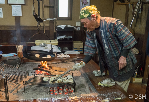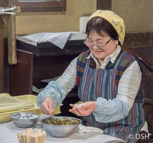 After dropping our luggage at the hotel, we took a bus to the top of town, a short distance, where we stopped to make oyaki buns filled with bean paste and veggies, one of each. We rolled the dough and stuffed them, then took a 20-minute stroll while they cooked. Two rolls each with miso soup was a perfect lunch.