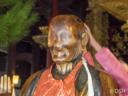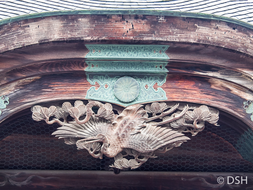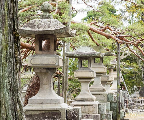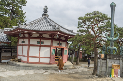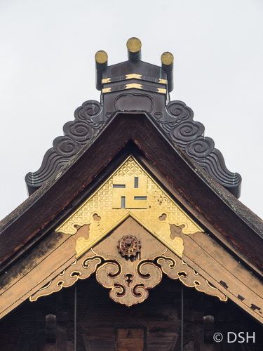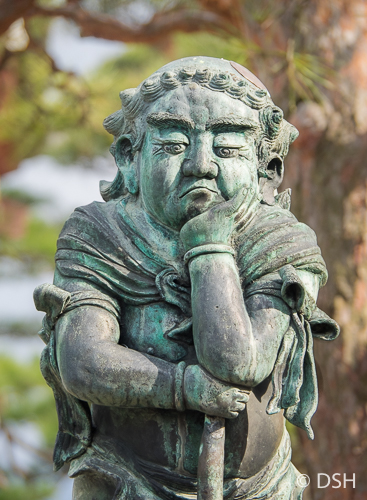 The rain slowed a bit, so we walked back to the port, climbing up to the base of the five-storied pagoda on our way. I paid to enter hall of adjacent Hokoku Temple, removing my shoes, so I could take pictures without getting my camera wet. I had left my umbrella behind in Kyoto, so I was dripping by the time we boarded the ferry (my lightweight rain shell passed the test and kept me dry). From the ferry terminal it was about a half hour train ride back to the station where we caught a Shinkansen back to Kyoto.