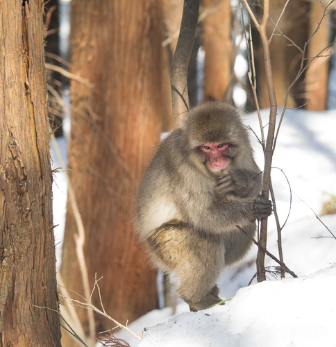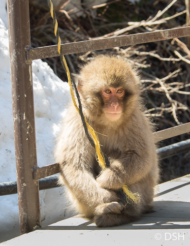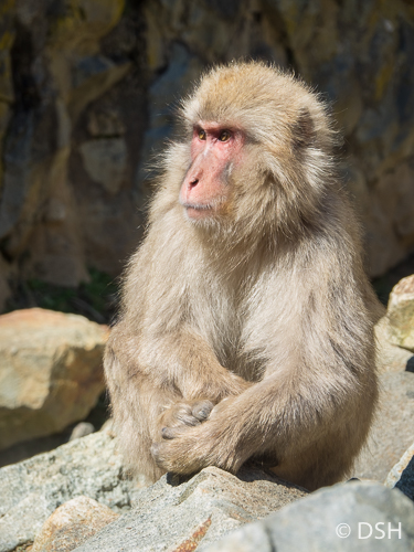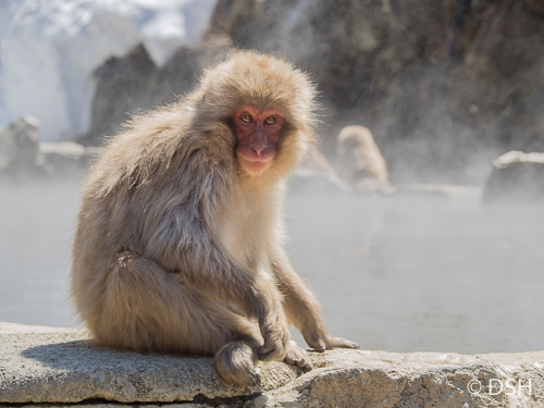 We took a forty-minute ride to Snow Monkey Park, mountains visible to our left. The walk from the bus stop to the park is about a mile and a half uphill, a challenge for Nancy especially since the last 1.6 km was a muddy snow-lined trail. It felt good to hike and I was excited to see my first snow monkey along the way, possibly one of the males that live on their own most of the year. The females and youngsters live communally in their troop. The park was relatively small with a manmade pond along a thermal stream. These red-faced Japanese macaques are acclimatized to people; the monkeys frolicked about ignoring us.