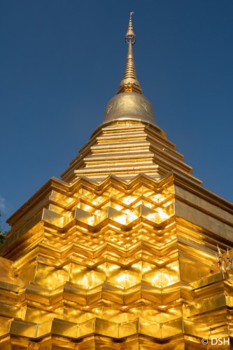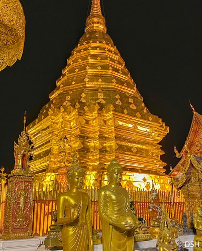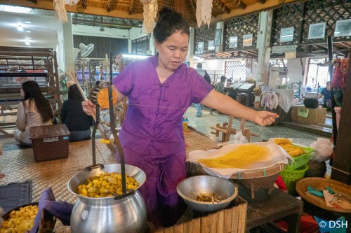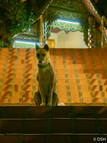 We met at 7:00 and walked in silence to Wat Tam Pha Plong, a small forest temple reached by ascending a rolling 510 steps. Along the way were many signs with Buddhist wisdom in both English and Thai. The gold-topped chedi was closed for renovation, but we were able to see the monks chanting and being fed breakfast on a set a rolling trays. We were invited to eat in the kitchen, but declined.