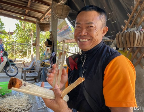 On our way back, Val and I detoured to Wat Tham Pak Piang, a temple dedicated to Quan Yin. The nuns were busy with the construction of a new Buddha and we were welcomed into a cave filled with statues. We could easily have lingered longer, there was another cave to explore, but we were hungry and didn’t want to miss breakfast. We got back just before the dining area closed at 10:30. I had crepes with fruit and a glass of lime “drinking yogurt”.